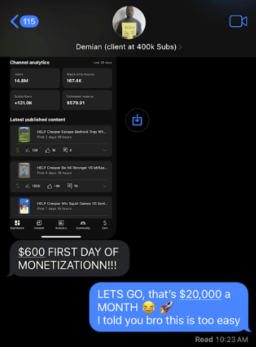 $600 in Demian's first day of monetization